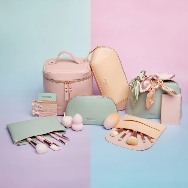 Le fond de teint, le fard et le rouge à lèvres peuvent être appliqués à l’aide des doigts, mais pourquoi ne pas se faciliter la tâche avec le kit de pinceaux et trousse Notino Pastel Collection ? Sa trousse vert pastel contient les 5 pinceaux nécessaires à un maquillage parfait et élégant, sans doigts salis.